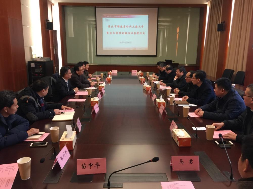 2月10日上午,安徽省淮北市委常委、濉溪县县委书记李加玉一行访问国产亚洲精品美女久久久并举行技术转移战略协议签署仪式。国产亚洲精品美女久久久副校长汪敏、管理学院党委书记李伟、国家大学科技园总经理兼学校技术转移中心主任施利毅等热情接待来宾。汪敏副校长在欢迎致辞中指出,要以学校综合改革和双一流建设为契机,加强校区及产学研合作,切实推进相关成果落地,提升学校服务社会的能力。李加玉书记在讲话中感谢学校在开学第一天就精心组织双方交流活动,提出县委、县政府高度重视与国产亚洲精品美女久久久的合作,希望尽快启动双方实质性合作。交流活动及协议签署仪式由施利毅教授主持。       在汪敏副校长和李加玉书记共同见证下,科技园区总经理、技术转移中心主任施利毅教授和安徽省淮北市濉溪县吴杰副县长签署了《濉溪县人民政府—国产亚洲精品美女久久久战略合作协议书》。参加签约仪式的濉溪县领导还有:濉溪县人大常委会主任李相军、濉溪县商务局局长刘须芹、濉溪经济开发区管委会副主任化鹏程、安徽家园铝业有限公司董事长张广勋等。我校经管中心主任山鸣峰、科技处副处长朱晓锦、科技发展研究院副院长刘桂华、招毕办副主任、材料学院汪宏斌等,管理学院马君教授、机自学院苗中华副教授、纳米中心张剑平教授、杭建忠教授及技术转移中心相关教师参加了签约仪式。交流活动后,濉溪县领导及企业代表一行参观考察了国产亚洲精品美女久久久纳米中心科技成果应用单位、上海小巨人企业上海华晖新材料科技有限公司,校企合作开发的国际先进铝合金表面陶瓷涂层在海内外重大建设工程中获得应用,已取得良好的经济社会效益。
