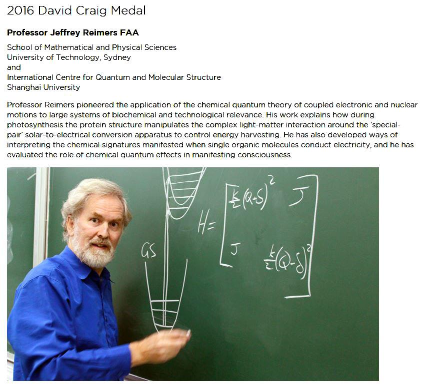 Jeffrey Reimers 院士获2016 David Craig Medal奖公告网站: