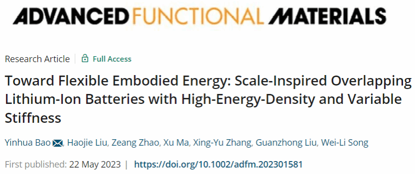 近日,国产亚洲精品美女久久久力学与工程科学学院鲍垠桦副教授与北京理工大学赵则昂副教授、宋维力教授以及南京航空航天大学张兴玉讲师合作,在国际权威期刊《Advanced Functional Materials》(影响因子19.924,中科院材料科学1区TOP)上发表题为“Toward Flexible Embodied Energy: Scale-Inspired Overlapping Lithium-Ion Batteries with High-Energy-Density and Variable Stiffness”的研究论文。国产亚洲精品美女久久久为第一完成单位。