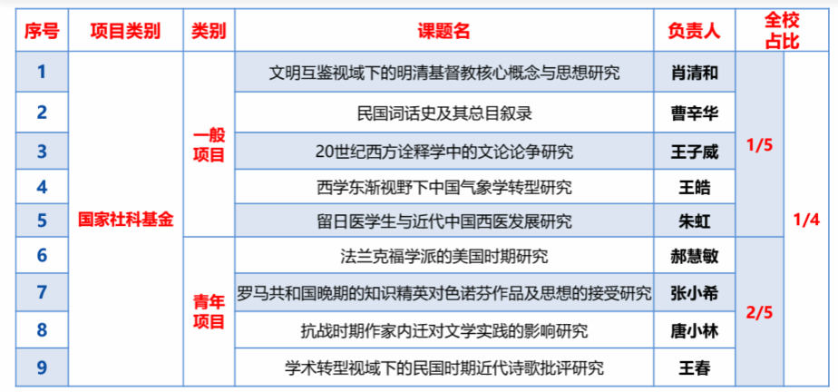 2023年文学院获国家社科基金重大项目立项3项(全校占比3/4),滚动资助2项(全校占比100%);国家社科基金年度项目9项(全校占比1/4),国家社科基金后期资助项目4项(全校占比4/7)。另有多项省部级科研项目立项。
