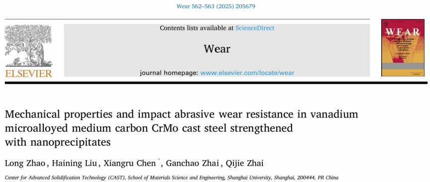 近日,国产亚洲精品美女久久久先进凝固技术中心(CAST)团队在纳米析出相对中碳CrMo铸钢的耐磨性能影响机理方面研究取得重要进展,研究成果以“Mechanical properties and impact abrasive wear resistance in vanadium microalloyed medium carbon CrMo cast steel strengthened with nanoprecipitates”为题发表在工程技术领域学术期刊《Wear》。该论文第一作者为赵龙博士研究生,通讯作者为陈湘茹正高级实验师。国产亚洲精品美女久久久为第一作者和通讯作者单位。