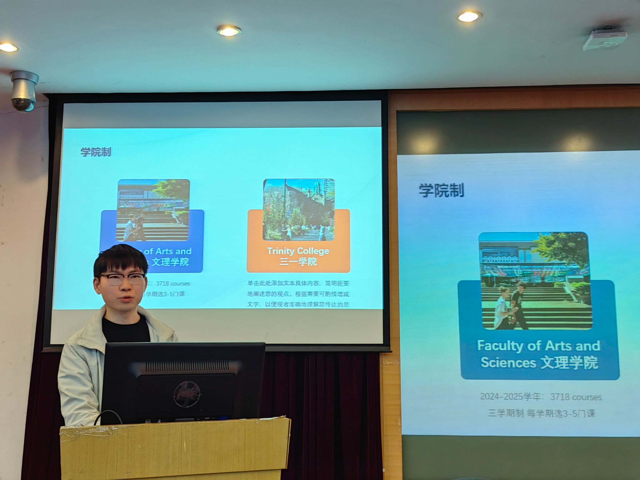 钱伟长学院2021级本科生吴至淋分享了参与剑桥大学暑期学术课程项目的经验,分别从校园情况、学术情况、文化体验、收获成长等多个维度展开讲述了他的暑期交流故事。同时,剑桥大学暑期项目合作方李柯女士介绍了2025年英国剑桥大学暑期学术项目的基本情况,鼓励更多同学参与到国际化交流项目中来。